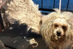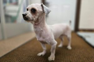 “He was terribly overgrown and dirty – his breed, (Shih tzu/Lhasa Apso) has hair that grows and needs frequent grooming/trimming,” she said. “He had clearly not had his hair cut in his life; he couldn’t see through the tangled mats, and it affected his mobility.”