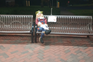 Most of the scarecrows were placed in front of the main entrance on the Library green between the building and library walkway. However, some of the scarecrows were also placed outside of the South Windsor Community Center.